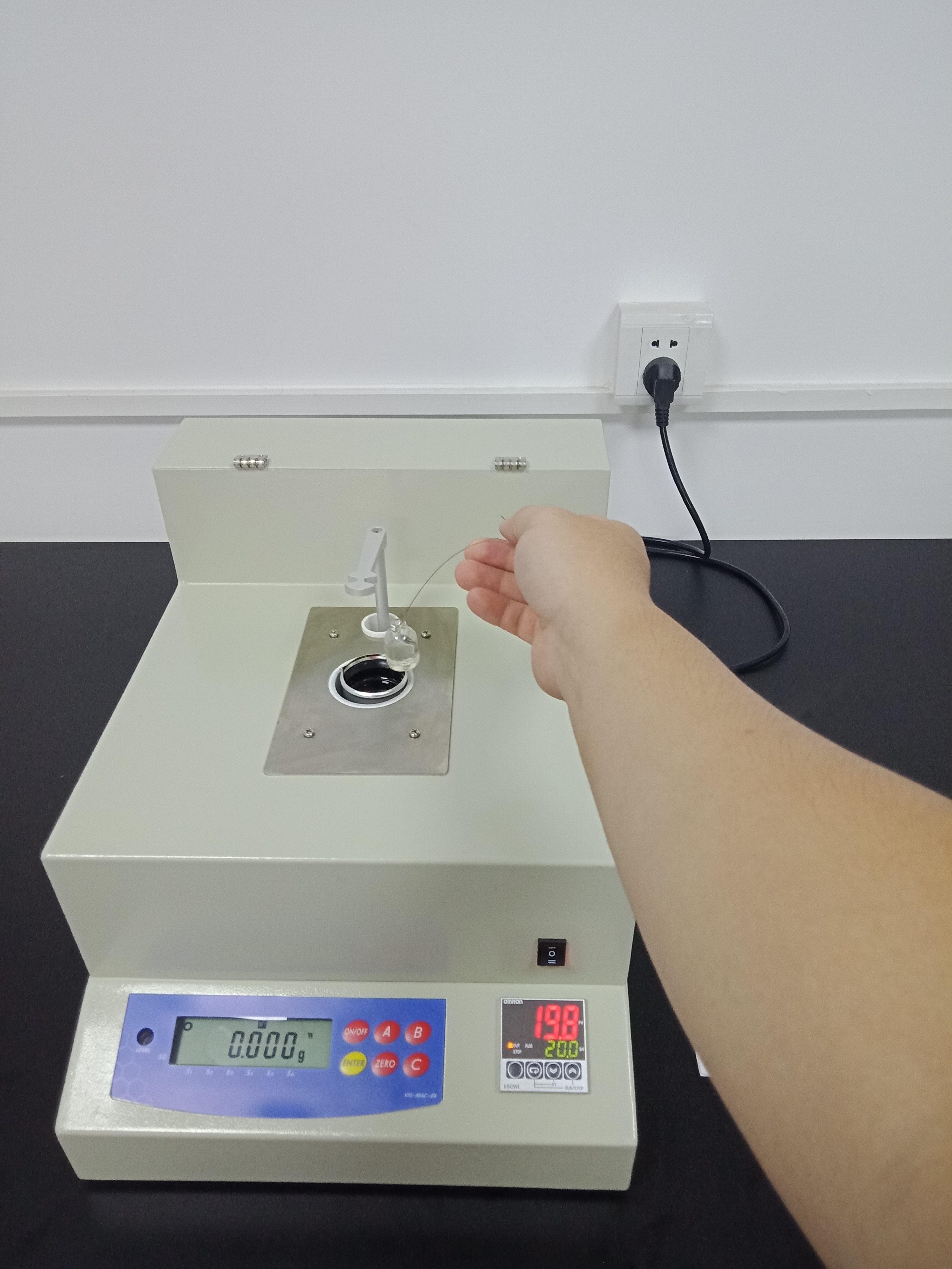1,開啟測試儀器DE-120API-T,將儀器溫度設定為20(如圖1),在儀器的恒溫槽中添加10ml的純凈水,用測量杯裝取40ml石油類測試樣品后,將測量杯和測試砝碼放入儀器恒溫槽中進行恒溫(如圖2和圖3);