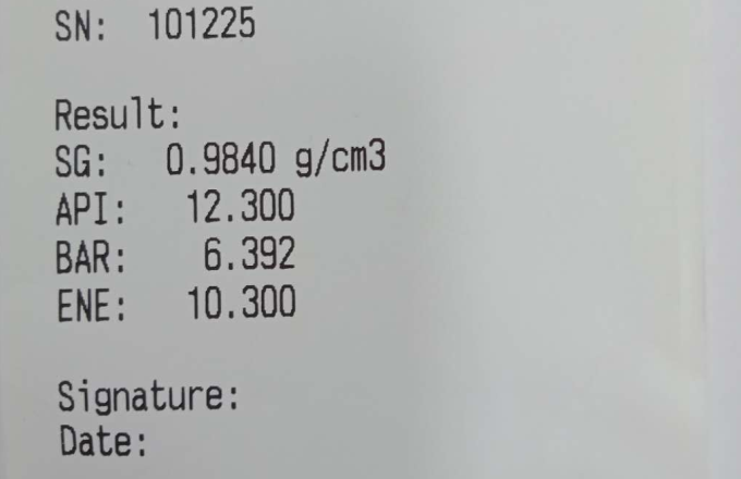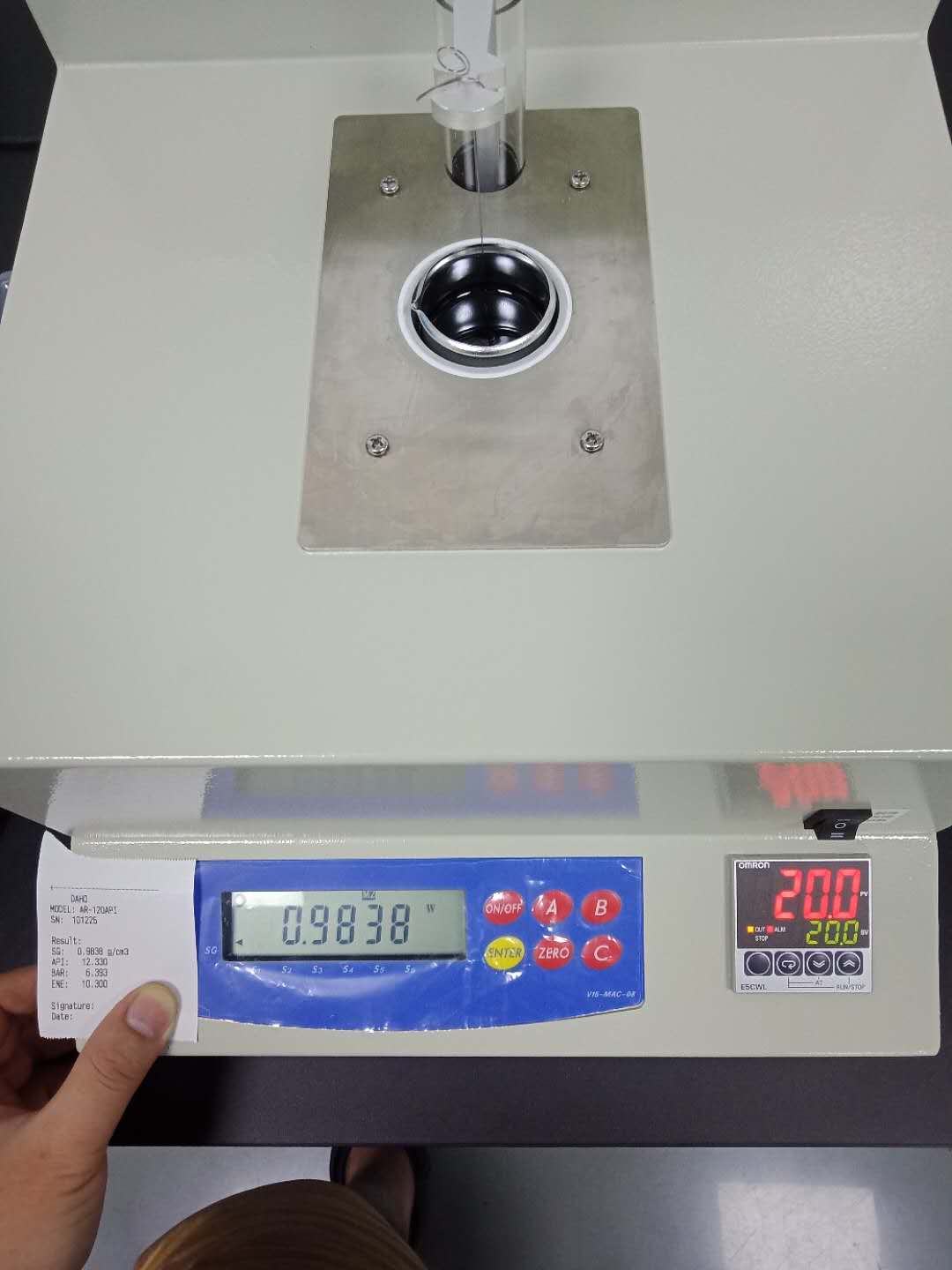 2,樣品恒溫到20后,將測試砝碼用掛鉤吊在測量架上,待重量穩定后按【ENTER】鍵,儀器屏幕顯示密度值,按【A】鍵切換到API值(S1=API),如下圖2(圖3為測試報告放大圖,SG=密度值)