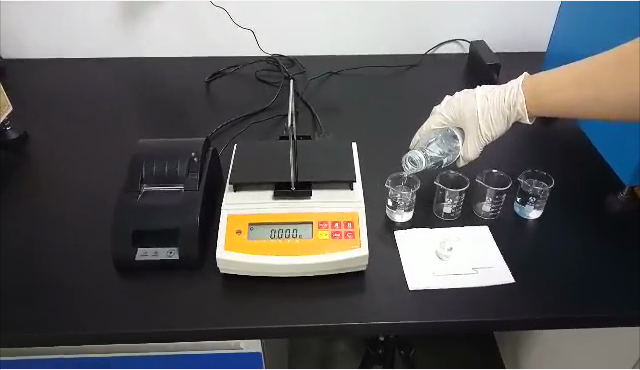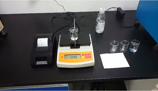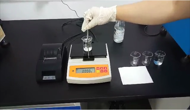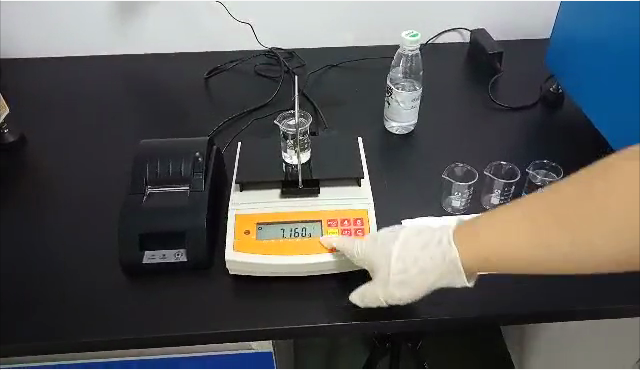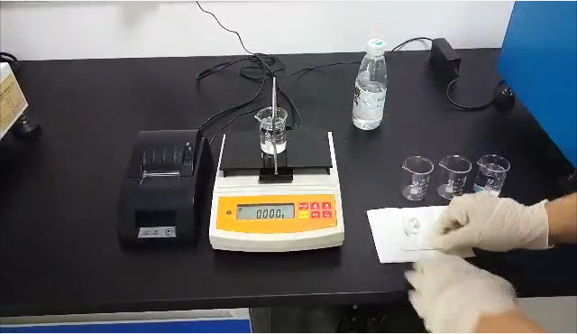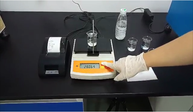 3,用掛鉤勾住測(cè)試用標(biāo)準(zhǔn)砝碼后,再將掛鉤垂吊在測(cè)試樣品的正上方,測(cè)試用標(biāo)準(zhǔn)砝碼浸沒(méi)在樣品里;