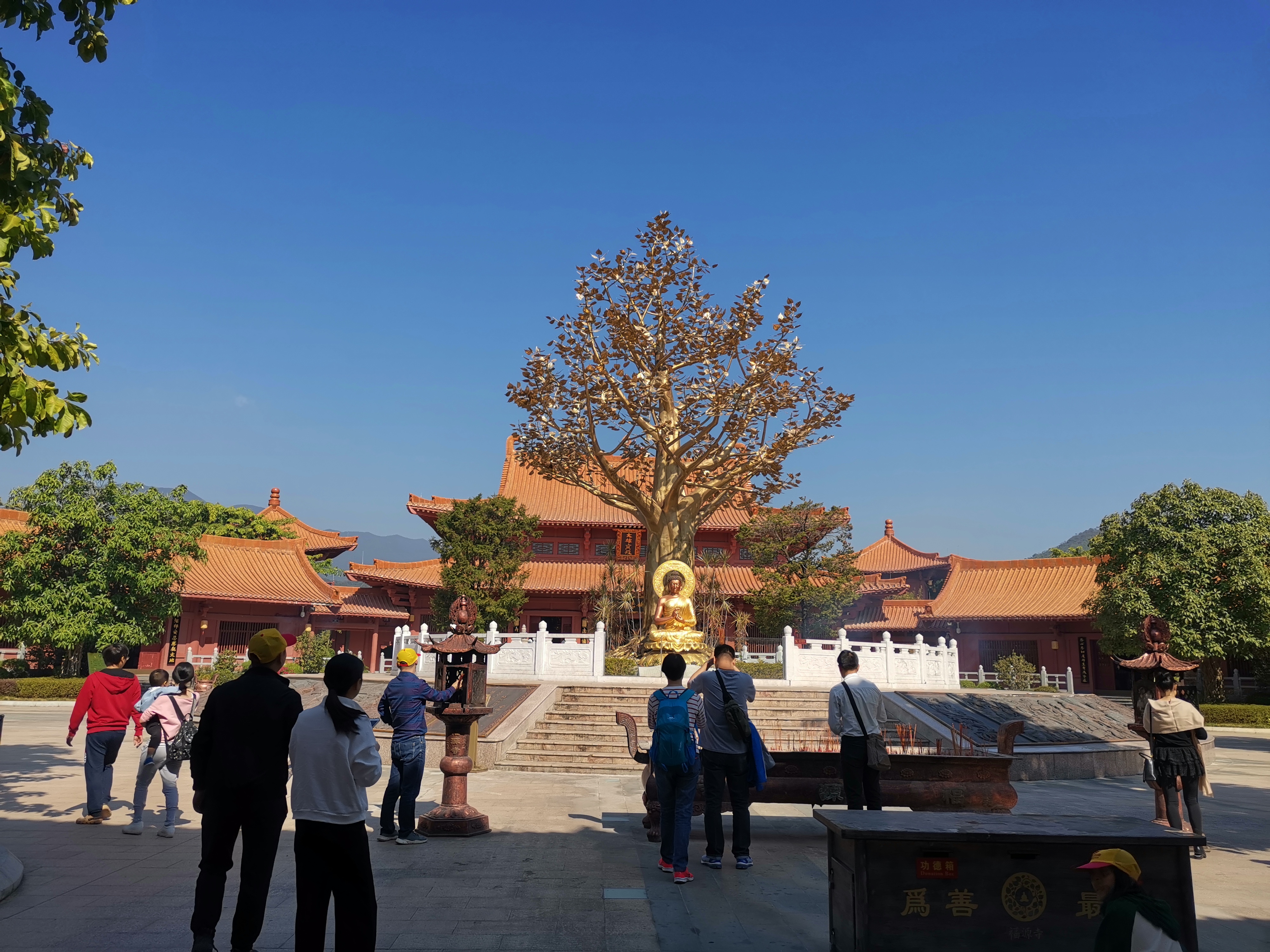 秋游河源的第一站是河源巴伐利亞莊園旁邊的福源寺,福源寺內(nèi)有一棵菩提樹,運(yùn)用18噸仿金銅鑄而成,是世間首座戶外金菩堤圣樹,全樹4800片金葉子枝繁葉茂,冠蓋如云,放異光明。