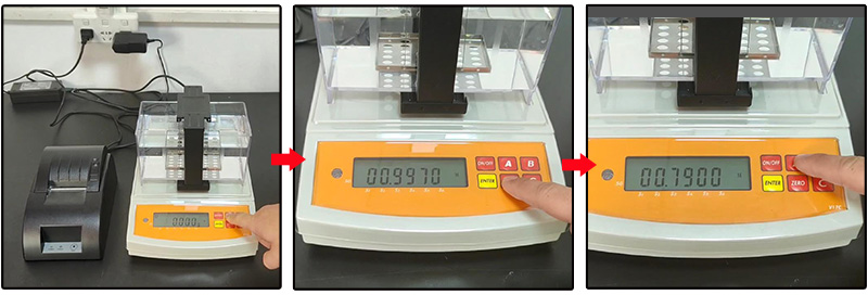 1、在0.000狀態下,屏幕上M1閃爍,將網球放入水中吊欄中央,玻璃杯放入測量架上,穩定符號“0”顯示后,按【ZERO】鍵扣除玻璃杯和網球的重量。