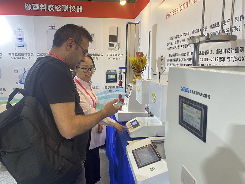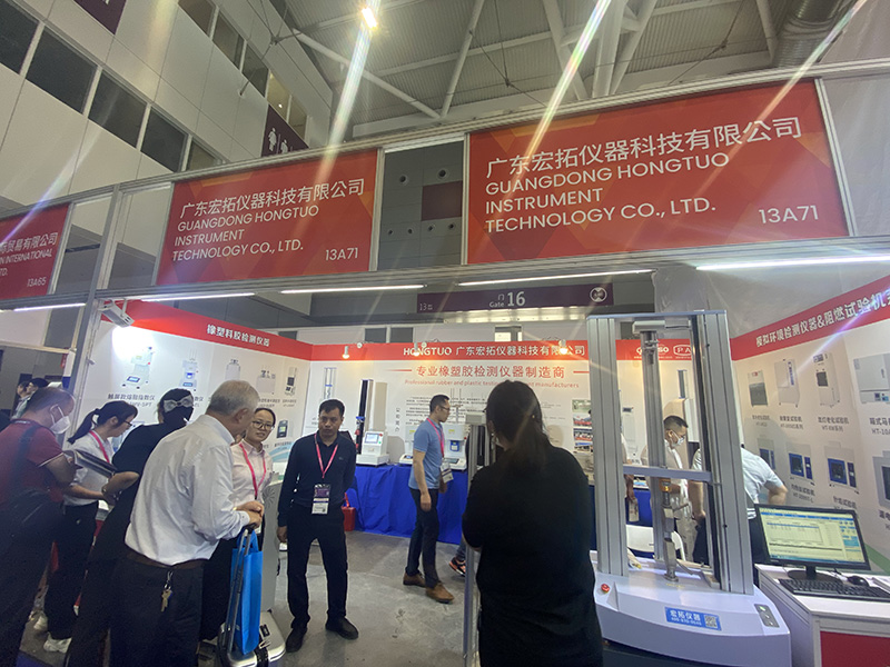本次展會中,廣東宏拓儀器不僅將公司拳頭產品雙柱拉力試驗機,單柱拉力試驗機,熔融指數儀,固體密度測試儀帶到展會上,還將最新自主研發的沖擊試驗機,維卡軟化/熱變形溫度測試儀和流變儀等儀器在這次展會上首次亮相,瞬間吸引不少來訪客戶的興趣和咨詢。