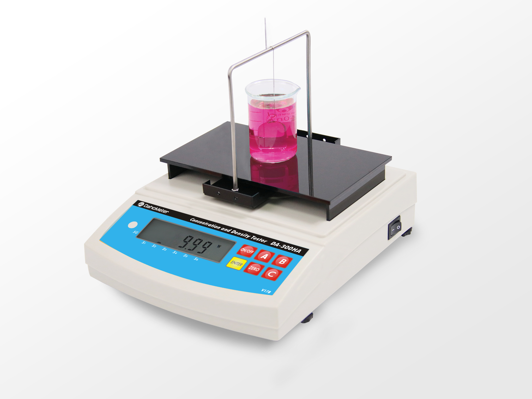 2、將標(biāo)準(zhǔn)砝碼浸沒在樣品中并用掛鉤懸掛于測量架中央,顯示即為鹽酸濃度,標(biāo)示符號指向S2